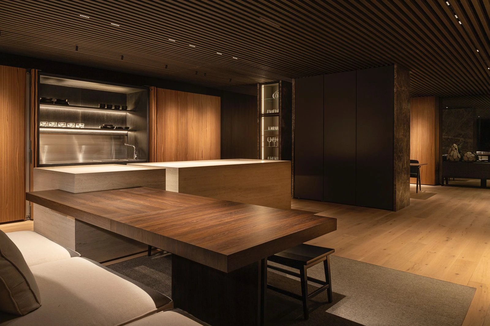 La materialidad del proyecto se centra en el uso de madera de nogal y roble oscuro , con muebles en tonos gris semi-mate que equilibran la calidez de los acabados de madera.