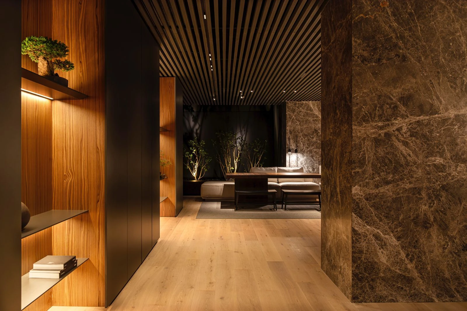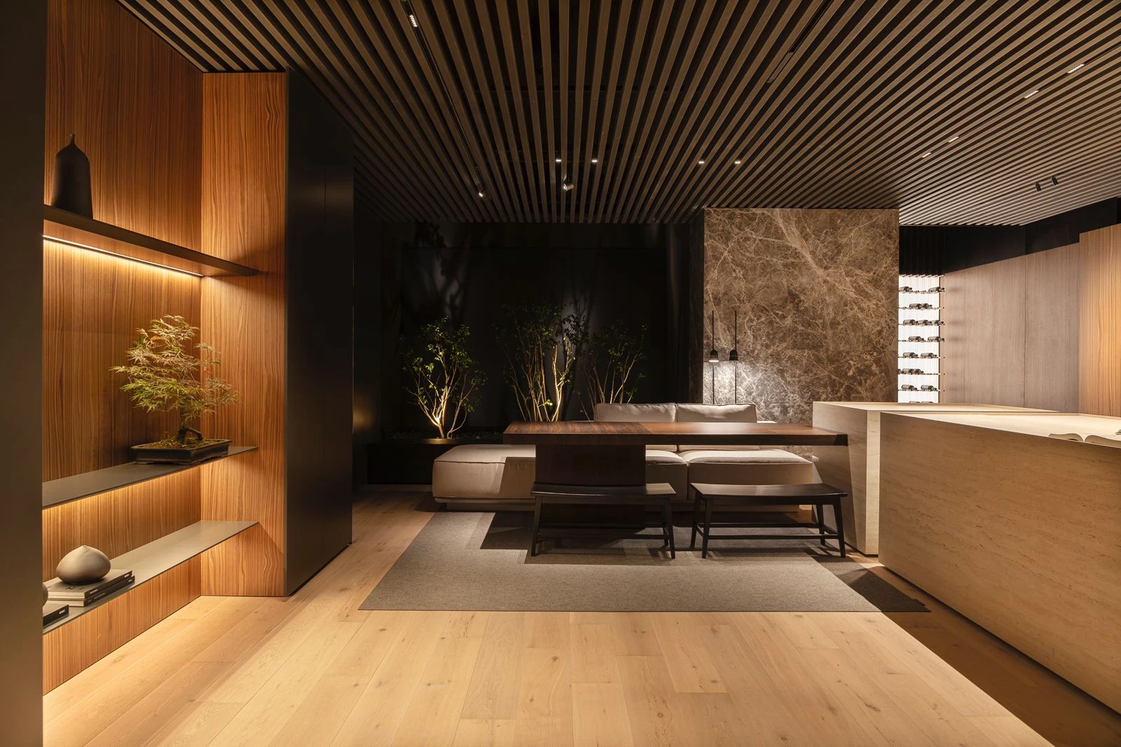 Es un espacio continuo, articulado a través de volúmenes de mármol que contienen funciones dentro y simulan ser planos macizos dejando entrever los distintos escenarios.