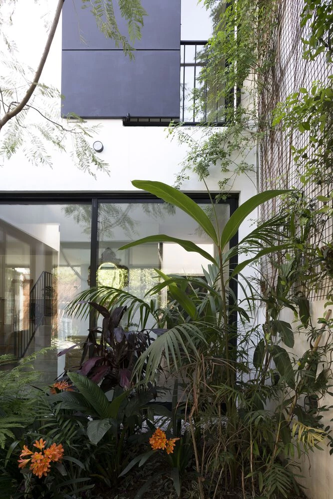 El primero delimita el espacio en zonas de usos específicos. Un segundo patio funciona como expansión de la vivienda y como telón de fondo.