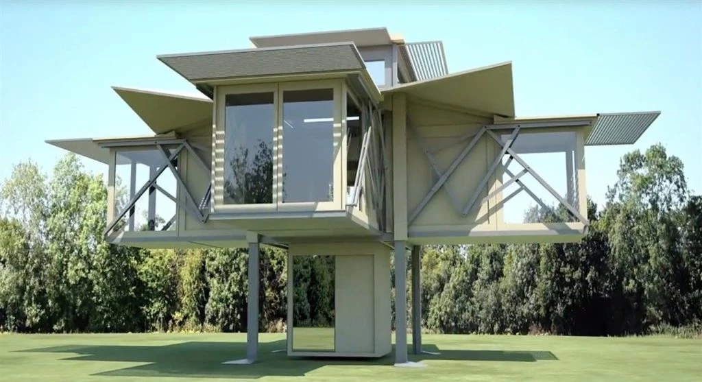 La última propuesta se consagra como la más espectacular e innovadora: se trata de una casa prefabricada plegable de la firma Ten Fold Engineering que con solo apretar un botón y en apenas diez minutos, el módulo transportable en camión se despliega para conformar los espacios, las ventanas, las terrazas y la entrada. El chasis, las palancas y el resto del soporte de los paneles son de acero. El peso del conjunto suma 20 toneladas.