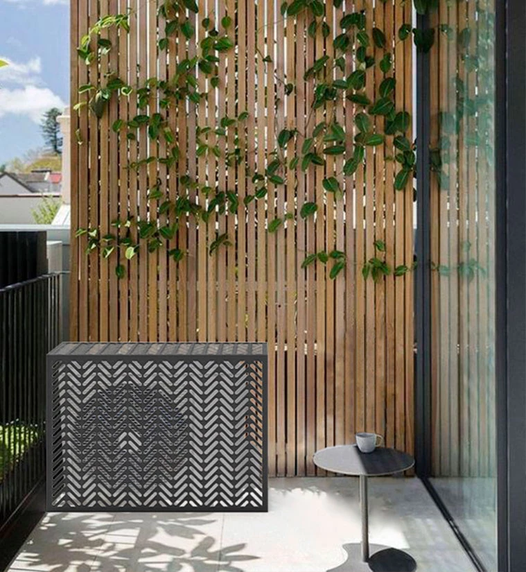- Para tapar el aire acondicionado: los cobertores de chapa perforada son muy populares para disimular estos equipos exteriores logrando una estética más armoniosa.