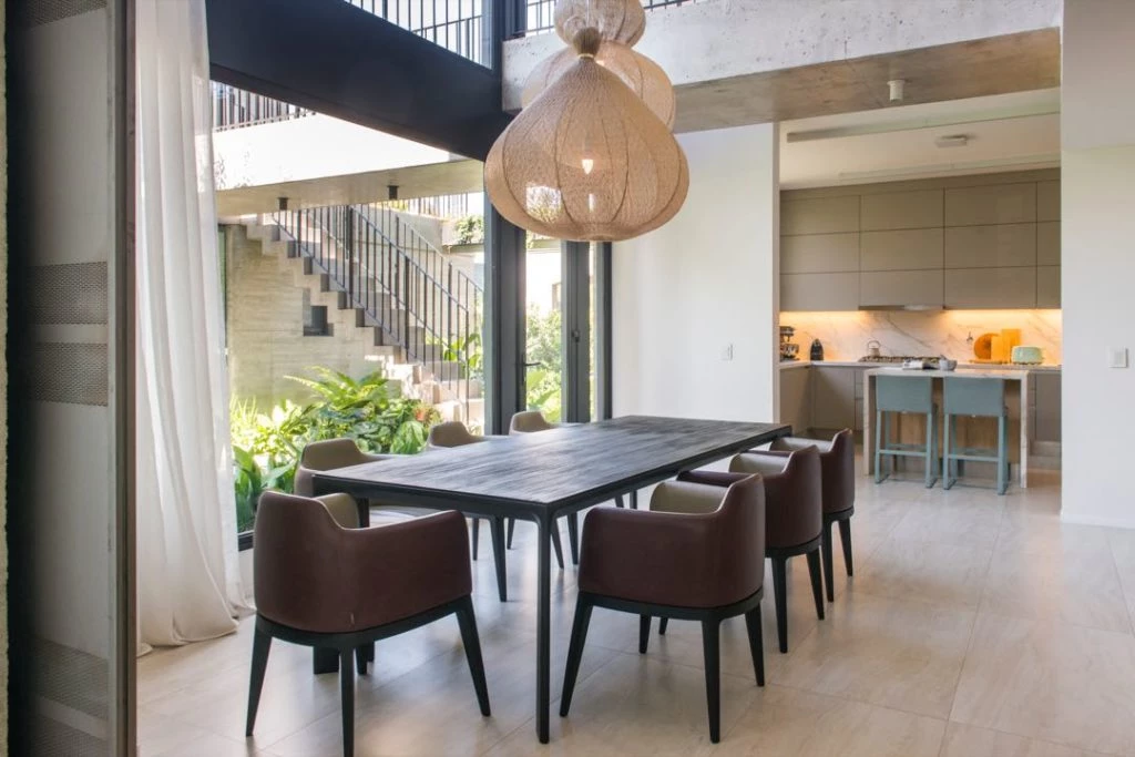 Un gran pórtico de dos hojas corredizas en metal separa al comedor del living si la situación lo amerita. En esta espacio luminoso, que cada verano se abre por completo al exterior, se destaca la mesa modelo Bone de madera laqueada, con sillas Silo en cuero marrón (@nostenargentina). Las lámparas Farola (@lafelizestudio) suman más diseño a este ambiente generoso en formas y texturas. Apliques de luz puntual (@fabricadeluz.ba).