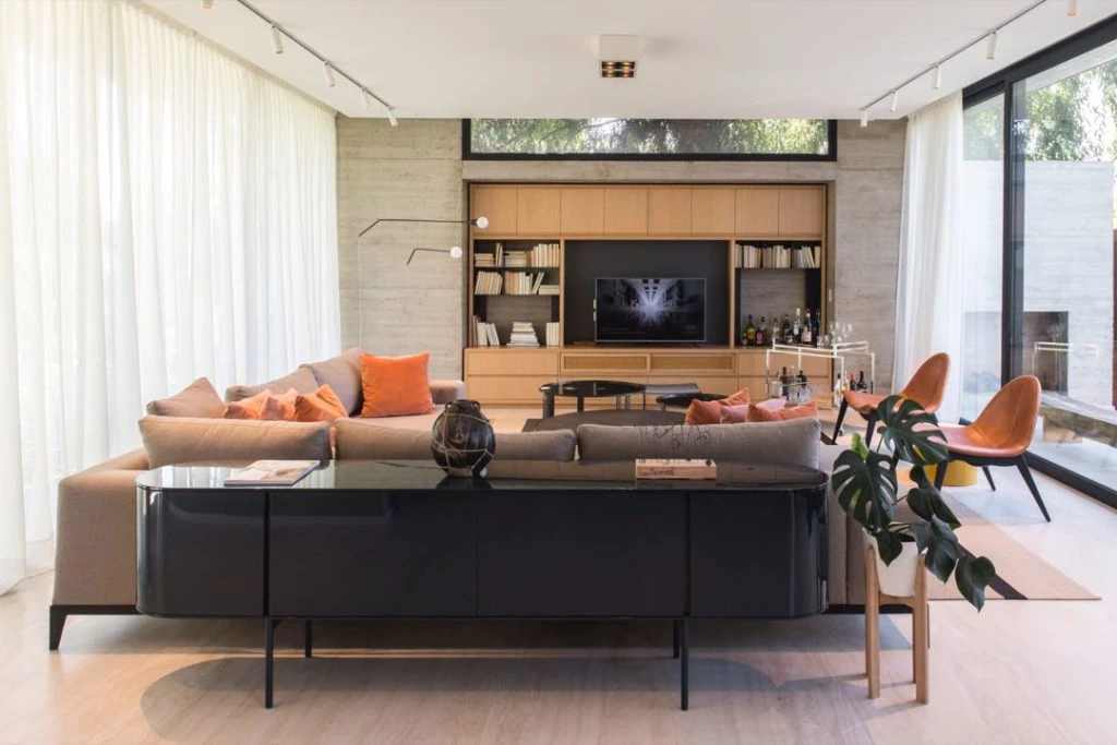 En primera plano, se destaca la mesa consola laqueada modelo Salvat (@nostenargentina). El sofá en "L" Chelsea, tapizado en color gris (@nostenargentina con género de @delevie_telas) se enfrenta a unas mesas bajas Otto en metal y piedra (@solskenba) y una mesa con tapa redonda Pluvial, en color ocre (@federicochurba). Como cierre, sillas Paraná tapizadas en cuero (@nostenargentina). La gran biblioteca enchapada en roble de eslavonia, lleva la tevé al centro.