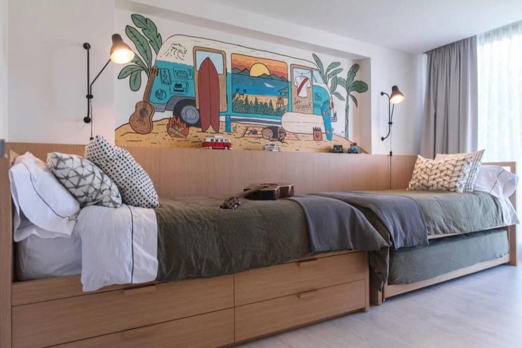 En el cuarto adolescente, las camas (diseño por @estudio.mm) están ubicadas en línea y llevan sábanas, edredón con funda, mantas pie de cama y almohadas de Best Linens, con géneros (@delevie_telas). Como fondo, un colorido mural en vinilo de @flordepampi. Lámparas modelo Cavia (@imdi.iluminacion).