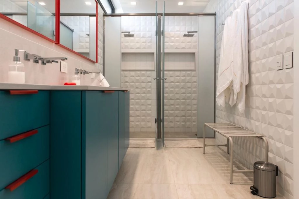 El baño de los adolescentes, suma color en el mueble bajomesada diseñado por @ estudio.mm, en turquesa con toques rojos que se repiten en el marco del espejo (@cristaldiseno). La bacha (Roca) suma grifería Dominic Lever (@fvsa). Banco (@el_yeite).