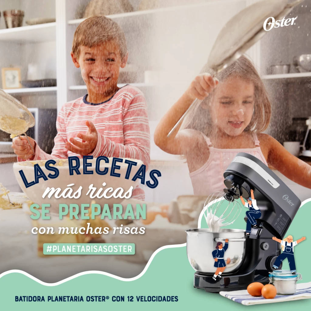Llevando la actividad de la cocina a la modernidad de hoy, Oster les da la posibilidad a los niños de poder participar del challenge #PlanetaRisasOster, en donde cada participante debe subir un video con la receta que hizo junto a los chicos, y el video más votado, será el ganador de una Batidora Planetaria Oster, que tiene un motor de 12 velocidades con 750 watts de potencia y un tazón de acero inoxidable con capacidad para 4 litros, incluyendo también accesorios para mezclar, amasar y batir.