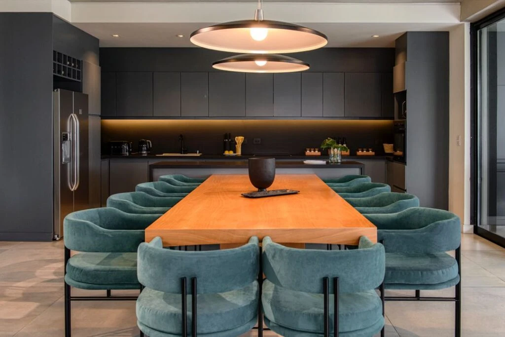Electrodomésticos inteligentes, superficies antihuellas y luces LED regulables hacen que el espacio sea funcional y sofisticado.