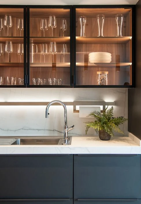 El vidrio templado gana terreno en las cocinas contemporáneas. Muy usado en puertas de muebles y mesadas, aporta un aspecto limpio y elegante, además de ser fácil de limpiar y mantener.
