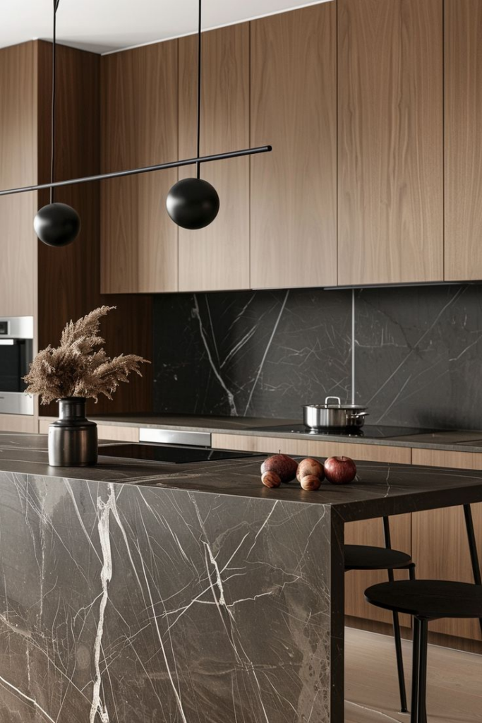 El mármol es sinónimo de lujo, pero en 2025 la clave está en los tonos oscuros como el negro o el verde profundo. Las vetas contrastadas aportan elegancia y dramatismo, ya sea en mesadas, islas o revestimientos.