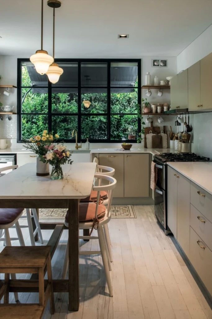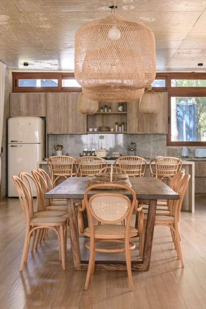 Y uno de los tips para conseguir un ambiente acogedor, es enmarcar la zona donde se come iluminando la cocina con una lámpara colgante baja y cálida.