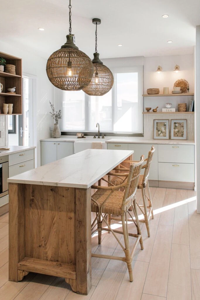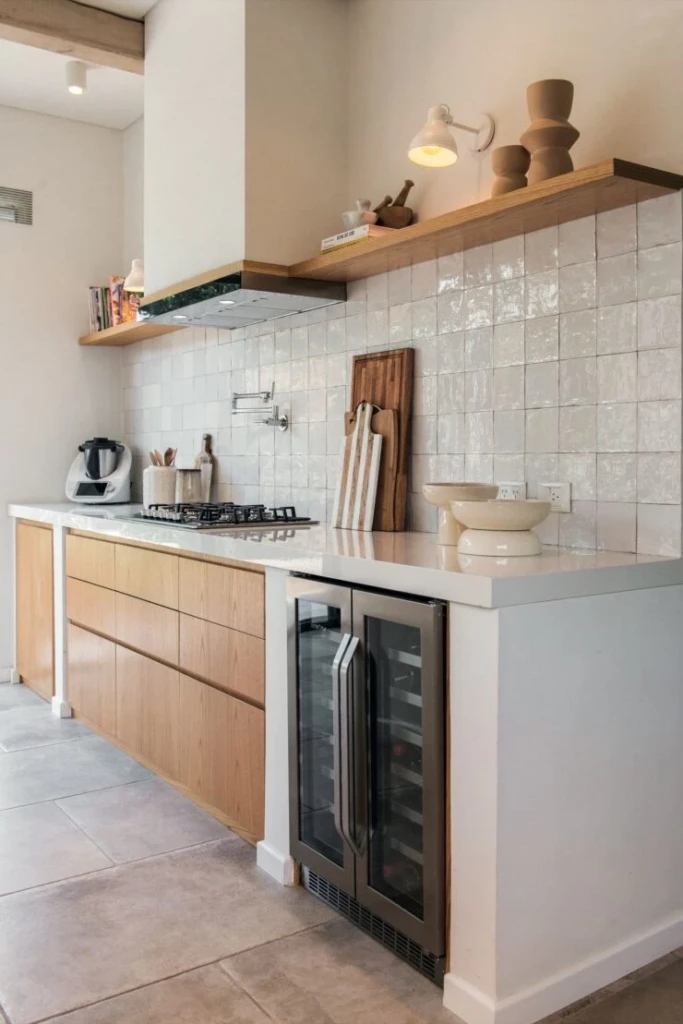 Lo mejor de todo es que podés integrar la madera fácilmente y sin gastar una fortuna, solo tenés que sumar algunos detalles como utensilios, tablas de cortar, estantes flotantes, una lámpara, etc. ¡Todo vale!