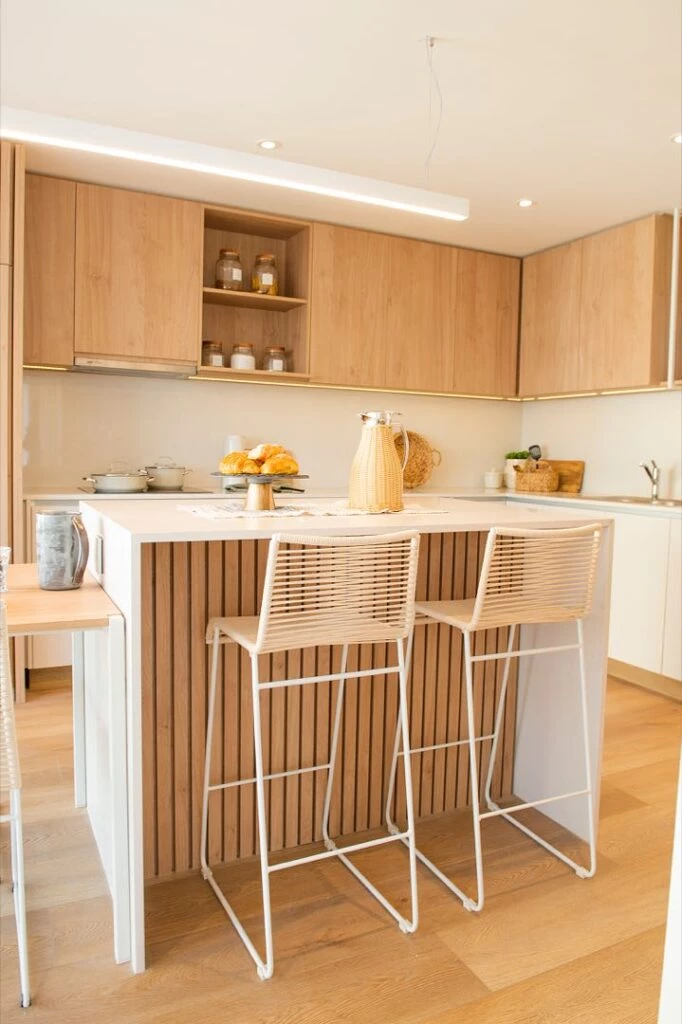 Por lo demás, todos los frentes de los bajomesada existentes fueron reemplazados por laqueados y guías de cierre suave; mientras que las alacenas fueron reemplazadas en su totalidad por otras con frentes en Roble Kendal (Egger).