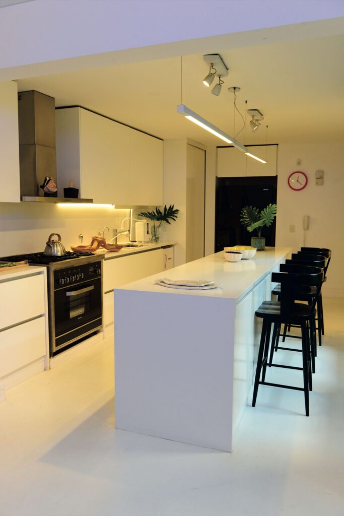 En este departamento ecléctico y para todos los sentidos, la cocina se integra con el playroom en un ambiente moderno y totalmente claro: pisos de cemento alisado blanco, alacenas en madera con terminación laqueada en blanco y mesadas de Silestone, por supuesto en riguros blanco.
