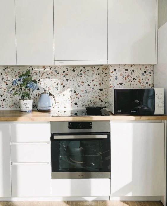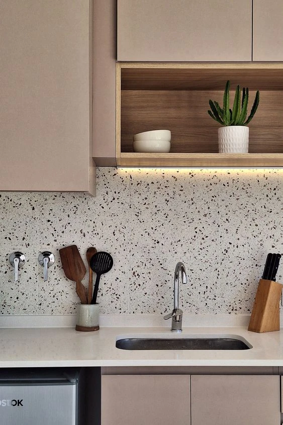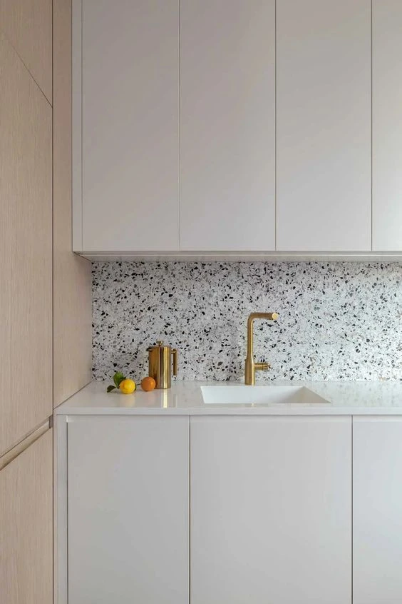 El terrazo, con granos más o menos importantes y combinando colores y materiales, es una tendencia que crece si de revestimientos para cocinas hablamos.