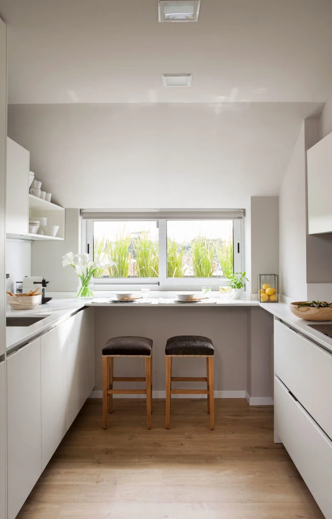 La disposición en U, también es muy utilizada en pequeñas cocinas abiertas, en donde uno de los lados cumple doble función siendo barra desayunadora y separador de ambientes.