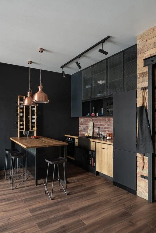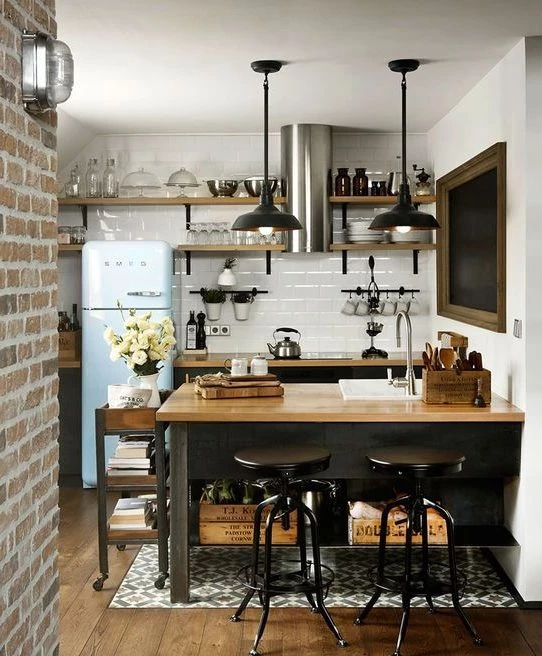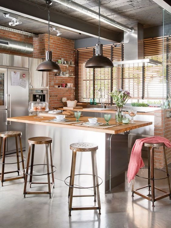 Es uno de los materiales estrellas de la decoración industrial y la encargada de llevar una buena dosis de calidez. Se puede incorporar en banquetas, sillas, mesa de comedor, estantes o incluso en algunas puertas de las alacenas.