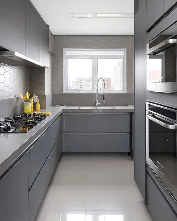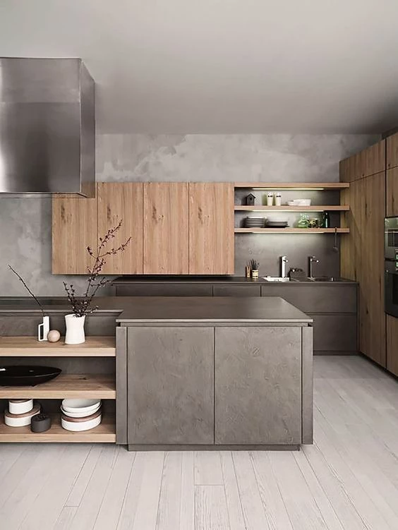 Combinar el gris con detalles de madera dará como resultado una combinación moderna, elegante pero también súper cálida y acogedora. Una de las variantes más elegidas consiste en aplicar el gris para una de las dos líneas de amoblamientos y dejar la madera -clara u oscura- para la otra parte.