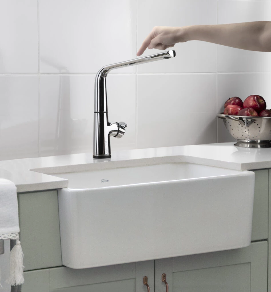 Con pico giratorio de 360° y accionamiento táctil, este juego para cocina se distingue por sus vértices redondeados y su delicado diseño. Permite abrir y cerrar la grifería con tan solo un suave toque de la mano, el codo o el brazo. Esta alternativa colabora con la reducción del consumo de agua y aporta practicidad a la vida diaria de sus usuarios.
