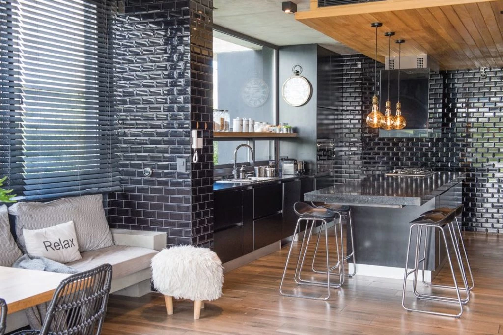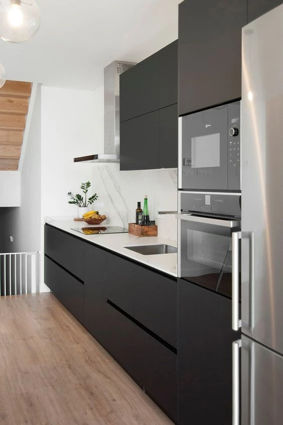 La selección de los materiales es otro punto clave a tener en cuenta, ya que una correcta elección puede intensificar la sensación de amplitud en una cocina negra.