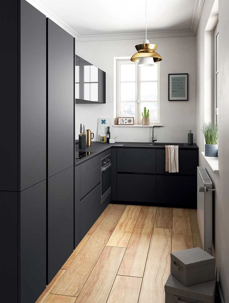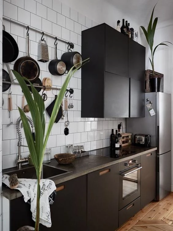 Si se trata de una cocina grande o chica, con amplios ventanas y buenas luces artificiales, la opción negro total de piso a techo, puede ser un acierto.