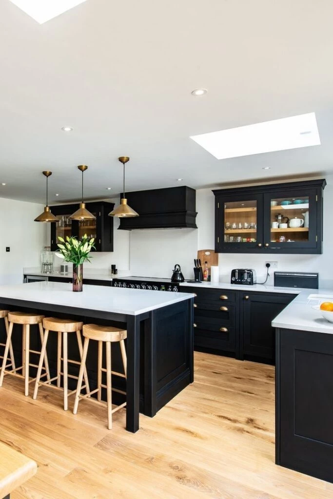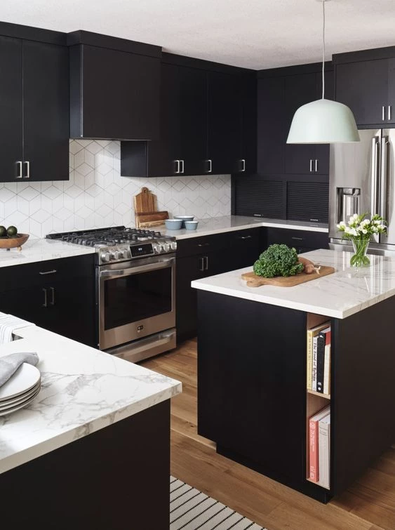 Es una opción muy acertada y moderna, perfecta para cocinas más chicas, ya el negro cede parte de su protagonismo al blanco, liberando la intensidad y la carga decorativa. Una opción es darle blanco a paredes y techo.