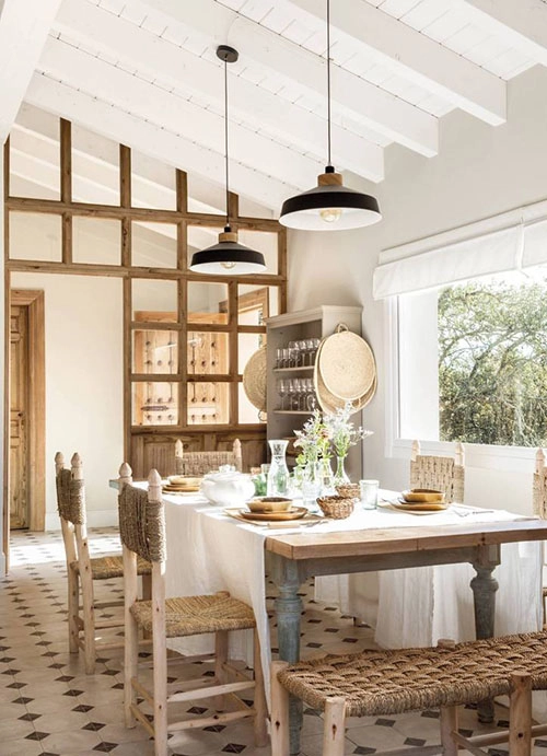 Los accesorios de fibras naturales como rattan, bambu, yute y mimbre son un must del estilo rústico y no pueden faltar, al igual que los textiles de algodón y lino.