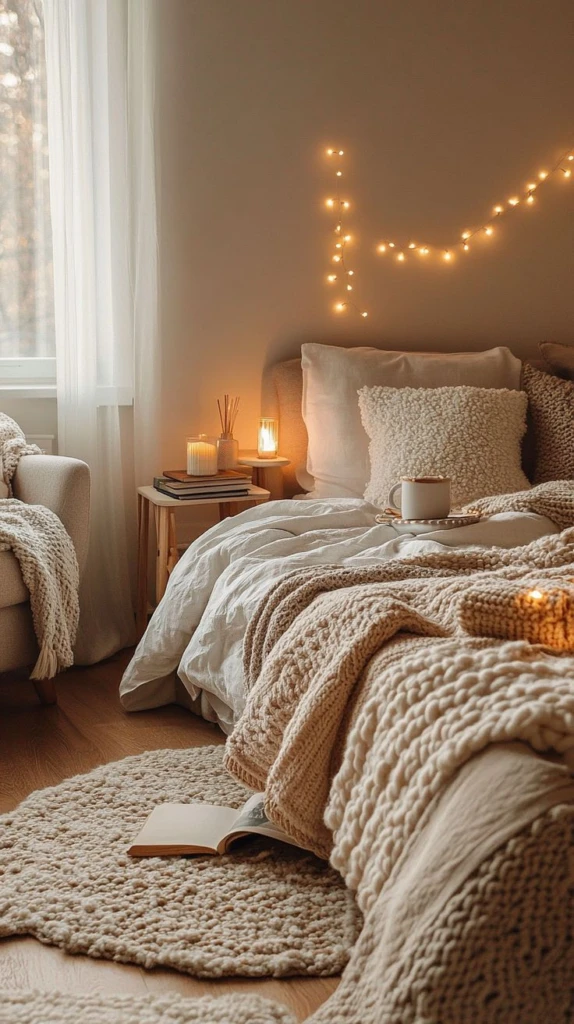 Si tenés lugar, creá una mini zona de lectura o descanso dentro del dormitorio. Una silla cómoda con una manta encima, una mesita con una vela aromática, una lámpara de pie y listo: tenés tu rincón de invierno. Ideal para leer, tomar un café o simplemente mirar por la ventana cómo llueve sin sentir culpa.