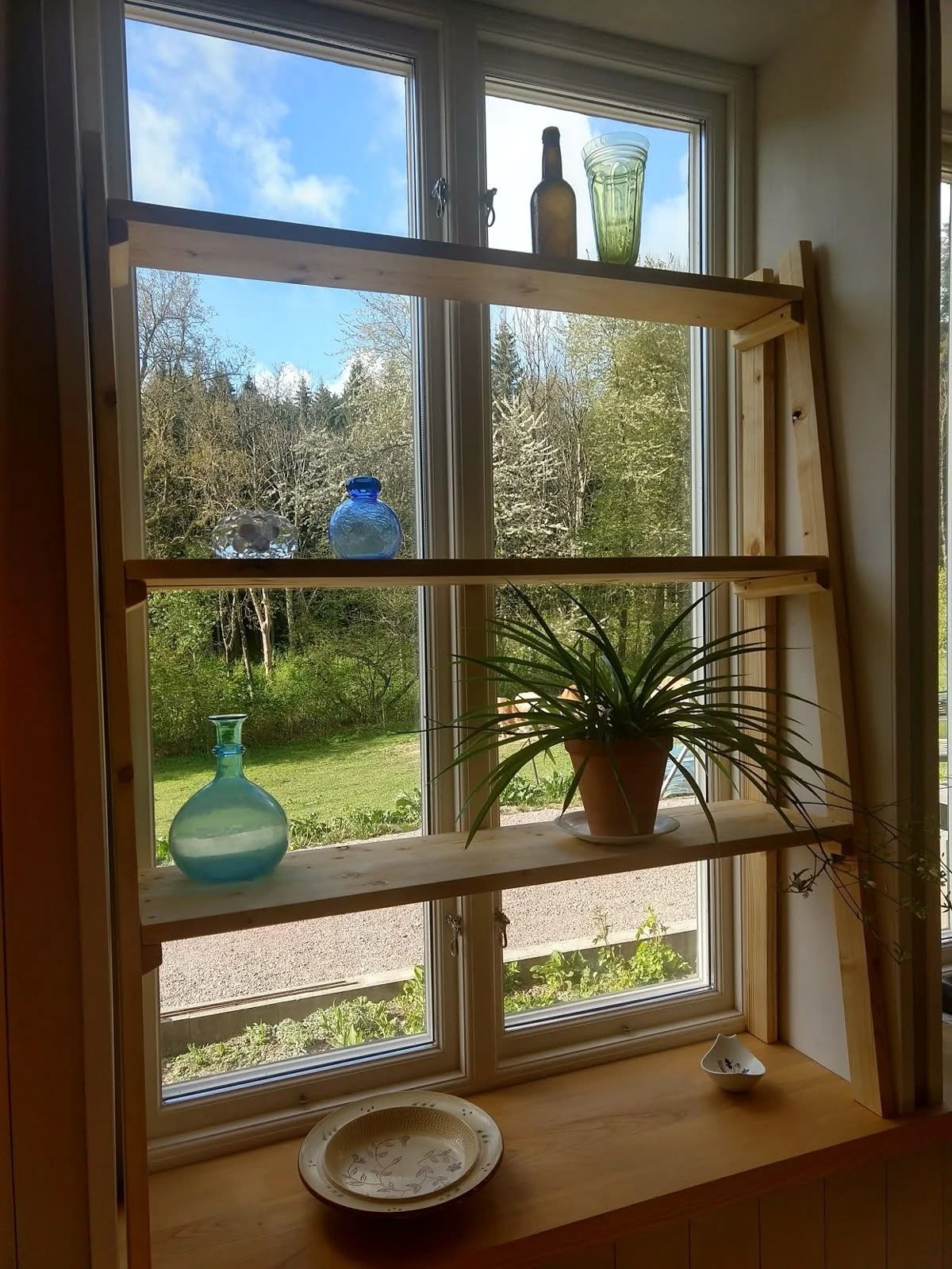 Colocada frente al vidrio y sin tapar por completo la ventana, funciona como filtro de luz y soporte decorativo para plantas, objetos o libros.