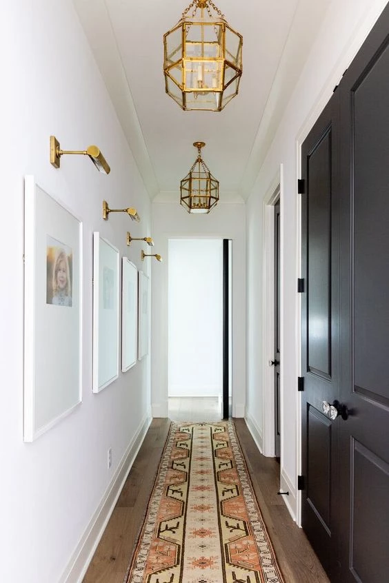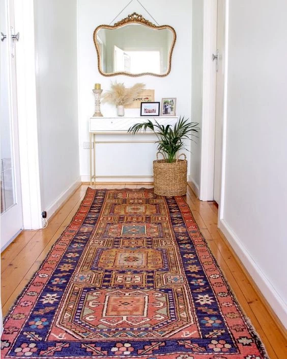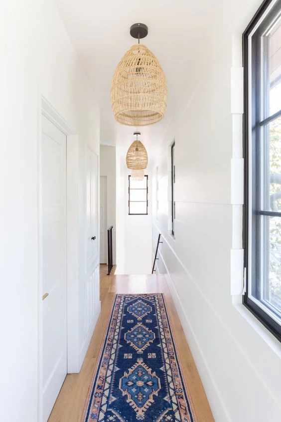 Pero si en tu pasillo la falta de luz no es un problema, podés animarte a sumar una linda alfombra colorida o con diferentes patrones, tipo kílim.
