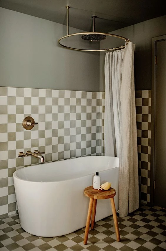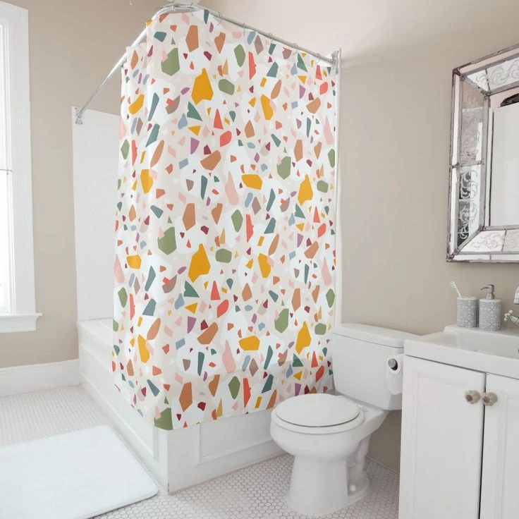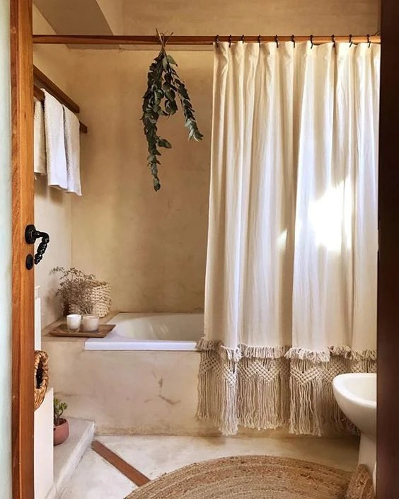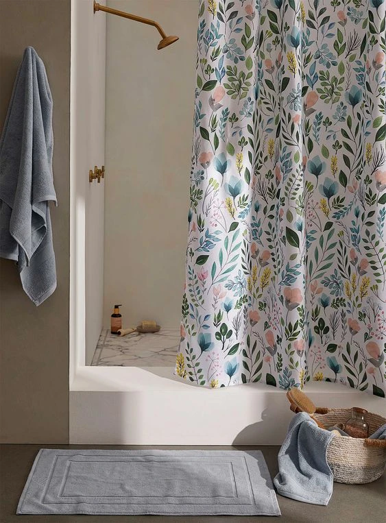 Si en el baño predominan los colores neutros, podés animarte y probar darle un toque de color con una cortina más llamativa.