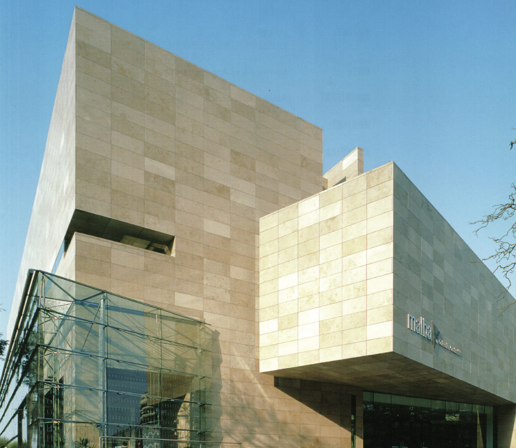 Entre otras cuestiones relacionadas al arte y a las piezas que tienen lugar en el museo, el MALBA se distingue por su fachada ventilada, que está integrada por piezas de 4 cm de espesor de Piedra Jura Beige, una caliza que se extrae en el sur de Alemania. La dureza y resistencia a los agentes externos hacen de la Jura Beige uno de los materiales naturales más apreciados para aplicar en las fachadas ventiladas.