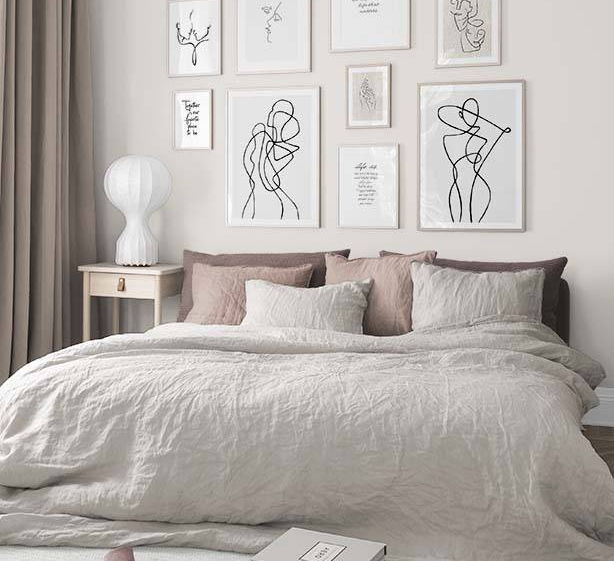 Si usás un sólo cuadro, tratá de centrarlo en relación a la medida del ambiente. Si elegís dos, colgalos en línea y con cierta separación. Y si preferís varios juntos, armá una composición asimétrica pero sin saturar.