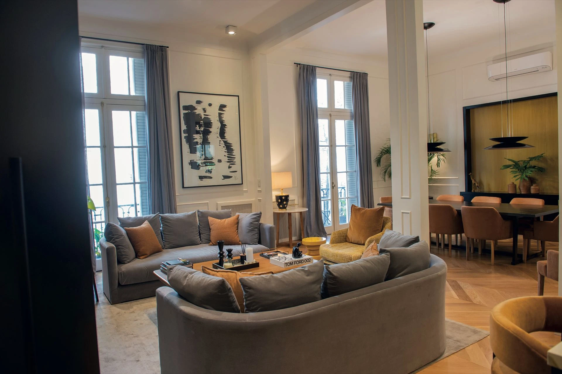 El mobiliario es de claro corte contemporáneo: dos sillones mellizos en terciopelo gris, con esquinas curvas que favorecen la circulación; más almohadones mostaza contrastantes.