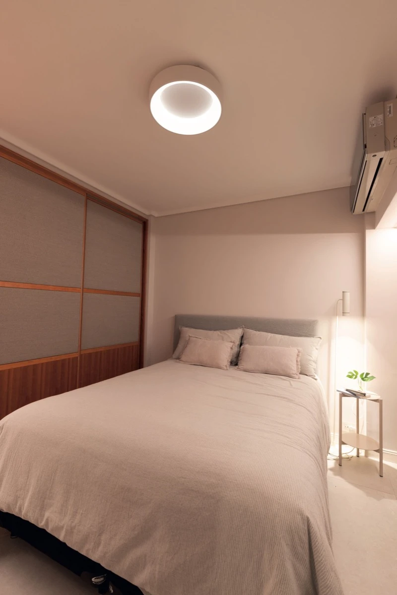 Entre otros detalles: la ropa de cama (Angelina Linen), lámparas de mesa (@fabricadeluz.b), luminaria de techo (@grupovonderk) y una alfombra en tonos de gris pensada y diseñada para este espacio (@estudioegido).