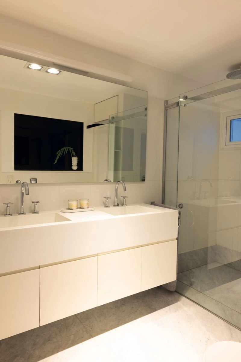 En el baño principal, con solado en mármol de Carrara, la reforma incluyó sumar nuevos espejos y un espacio de apoyo realizado en granito negro. La iluminación por abajo del espejo se enciende automáticamente al ingresar.