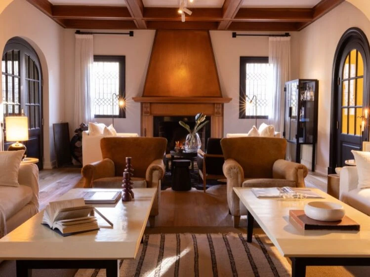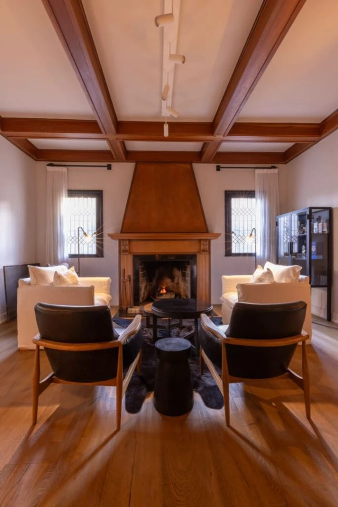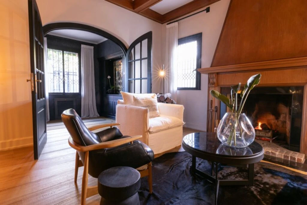 .La antesala fue pensada como un espacio de transición y contemplación. Cuatro sillones individuales – dos tapizados en lino natural y dos en madera con cuero negro- se disponen en torno a una gran alfombra de cuero de pelo oscuro. El foco indiscutido es la chimenea de época, restaurada y devuelta a su tono original por el estudio. Cada elemento fue cuidadosamente curado para sumar carácter: mesas auxiliares en mármol Marquina, bloques de madera quemada que funcionan como esculturas funcionales, y una vitrina diseñada a medida en hierro y vidrio que acompaña con liviandad y elegancia.
