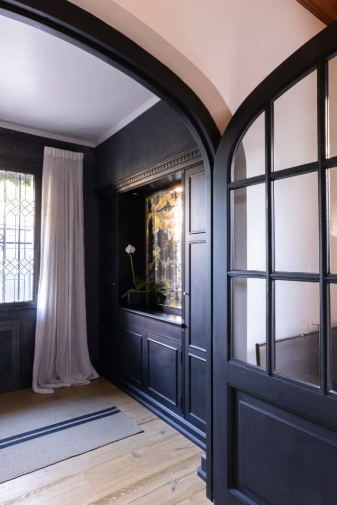 Una paleta de tonos contrastantes – oscuros y claros – genera impacto visual en el hall de entrada. Las cortinas de lino aportan textura, mientras que una alfombra de rayas en tonos neutros guía el recorrido hacia una pieza con historia: un mueble de guardado original de la casa, resignificado con pintura negra para integrarse al nuevo lenguaje estético. Aquí las paredes se pintaron también en un profundo negro y fueron intervenidas por un artista que aportó una capa de expresión única. El conjunto se completa con un espejo enmarcado en tonos bronce que simula ser antiguo, reforzando el carácter de esta entrada.