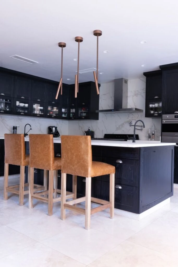 La cocina combina la elegancia atemporal con toques contemporáneos. Los muebles de madera negra con vetas visibles aportan profundidad y carácter, mientras la mesada blanca de líneas puras otorga un contraste luminoso y refinado. Las alacenas superiores con puertas de vidrio exhiben la vajilla cuidadosamente elegida. Banquetas altas en cuero camel con base de madera suman calidez y comodidad, creando un rincón para desayuno o charlas informales. El diseño se complementa con una imponente campana de acero y luminarias colgantes de diseño minimalista en tono cobre, que aportan un guiño vanguardista.