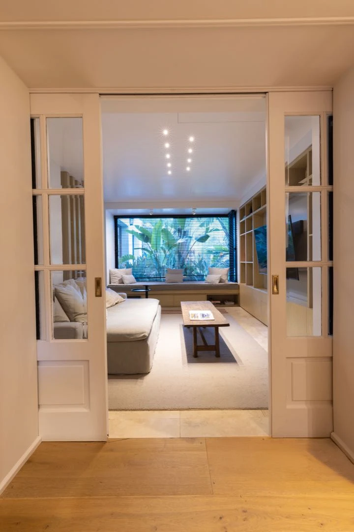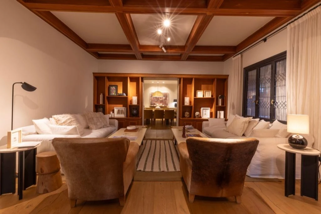 La ambientación del living privilegia una paleta clara en los sillones principales tapizados en lino. Las mesas bajas en pergamino suman calidez y rusticidad. Una gran estantería de madera, ubicada sobre la arcada que separa del comedor, fue restaurada y llevada también a su tono natural, funcionando como un marco elegante y funcional que conecta ambos espacios. Objetos de decoración cuidadosamente seleccionados y obras de arte que aportan personalidad y profundidad la transforman en un verdadero foco visual.