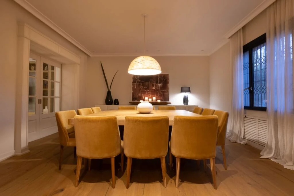 El comedor continúa el relato con una cuidada fusión de estilos. Un vajillero contemporáneo de tres metros de largo incorpora guiños orientales en los tiradores, aportando personalidad y refinamiento. La mesa cuadrada, tapizada en cuero, y las sillas de terciopelo bronce, crean un balance justo entre estructura, confort y calidez. La iluminación de techo – protagonista silenciosa del espacio (fue realizada artesanalmente por WIC, una firma que trabaja con fibras naturales como el fieltro) aporta una textura orgánica y atemporal al ambiente.
