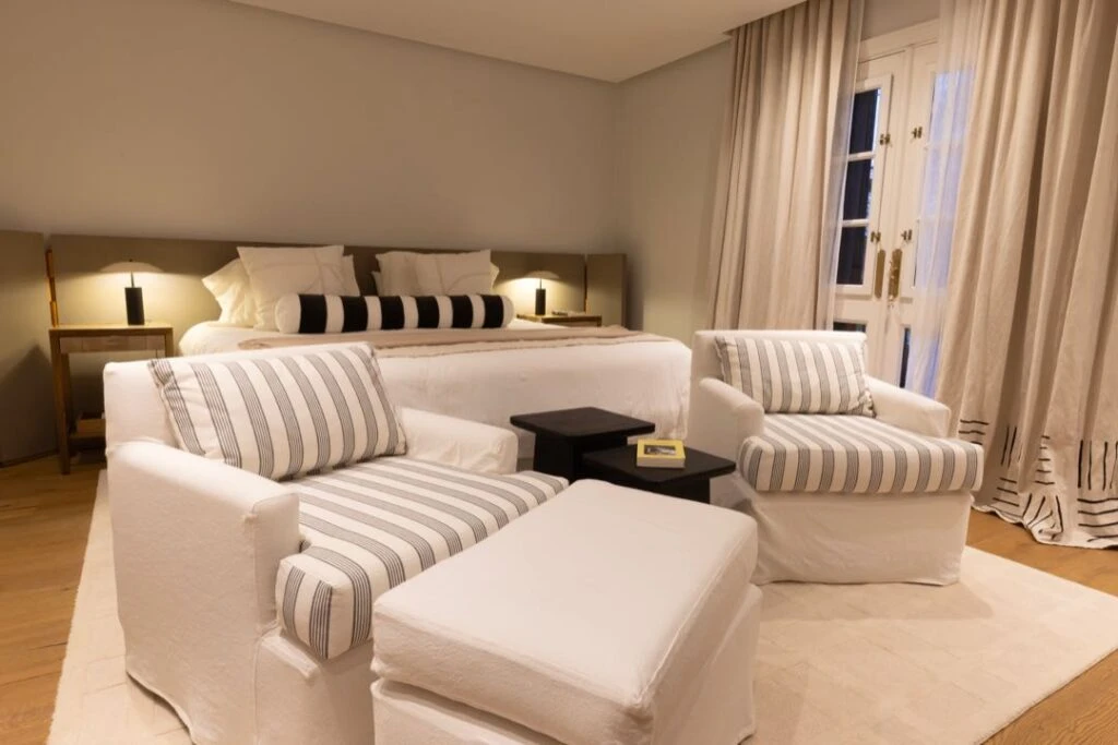 Frente a la cama, sorprende un pequeño living que se diseñó aprovechando la presencia de una chimenea original. Los sillones, tapizados en lino off white combinados con un género en algodón rayado, invitan a la charla y al descanso.