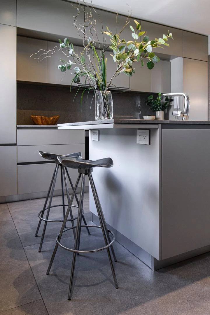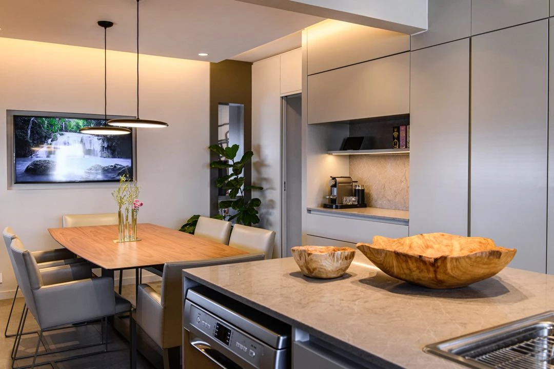 La cocina debía ser funcional y con un estilo “open show kitchen”, ya que está integrada con el comedor. Tiene muebles de guardado en enchapado laqueado color gris sin tiradores y una isla central íntegramente revestida en cuarzo Synphony Grey (Caesarstone) que es el centro de atención y suma pileta y el anafe. Para disimular la carpintería apaisada baja, se utilizó el recurso de armar una estructura metálica en la parte superior y por delante de las persianas de madera. Bajo ellas se ubica un vajillero diseñado a medida utilizando el mismo mix de materiales y colores.