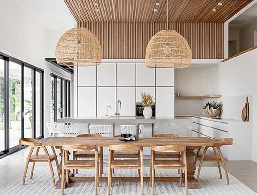 La iluminación -al igual que en el resto de la casa- es un factor fundamental. En espacios como los comedores, las lámparas de techo deben ser de un tamaño promocional al de la mesa: el diámetro tiene que ser por lo menos, la mitad del largo de la mesa. Es decir, si se cuenta con una mesa de 1,5 mts la lámpara debería tener por lo menos 70/75 cm. En cuanto a la altura, se recomienda que siempre esté entre los 60/80 cm, permitiendo que las personas que están sentadas frente a frente puedan verse entre sí.