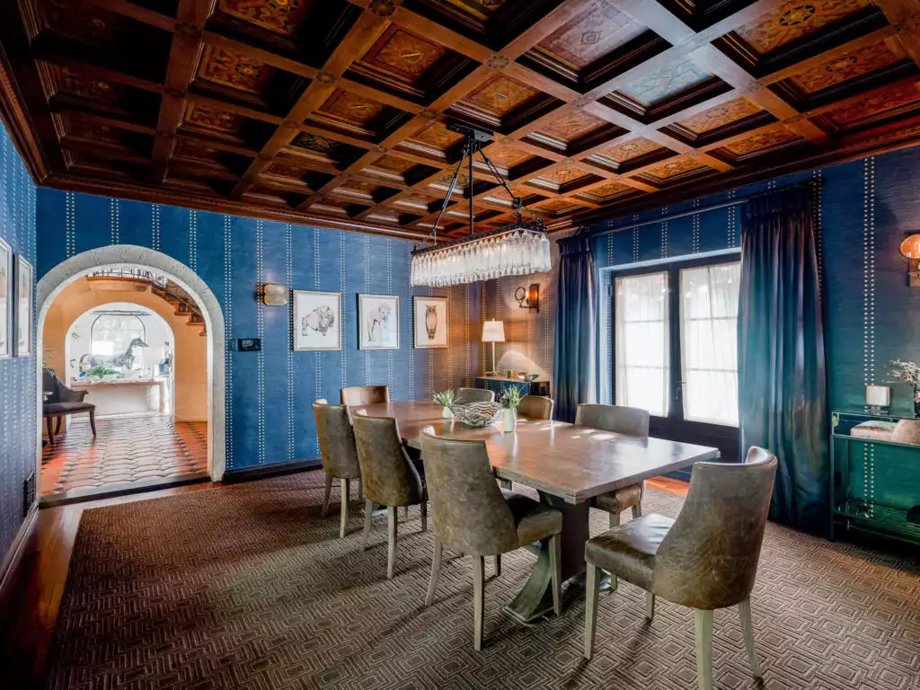 El lujoso comedor, cuenta con una alfombra que ocupa casi toda la superficie, paredes de color azul con tachas plateadas, sillas tapizadas en cuero, una enorme araña con cristales que ilumina por las noches y un techo de roble con diferentes figuras. Muy característico del estilo colonial español.