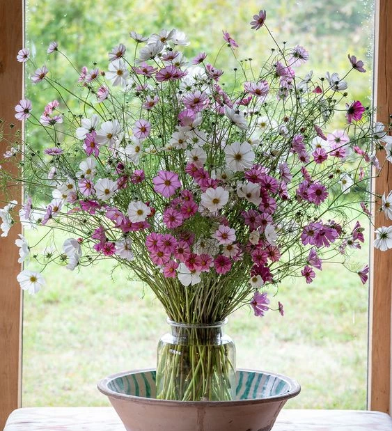 Además de ser muy popular en jardines informales, la planta del cosmos es ideal para usarse como flor de corte, ya que se mantiene muy bien en agua durante varios días.