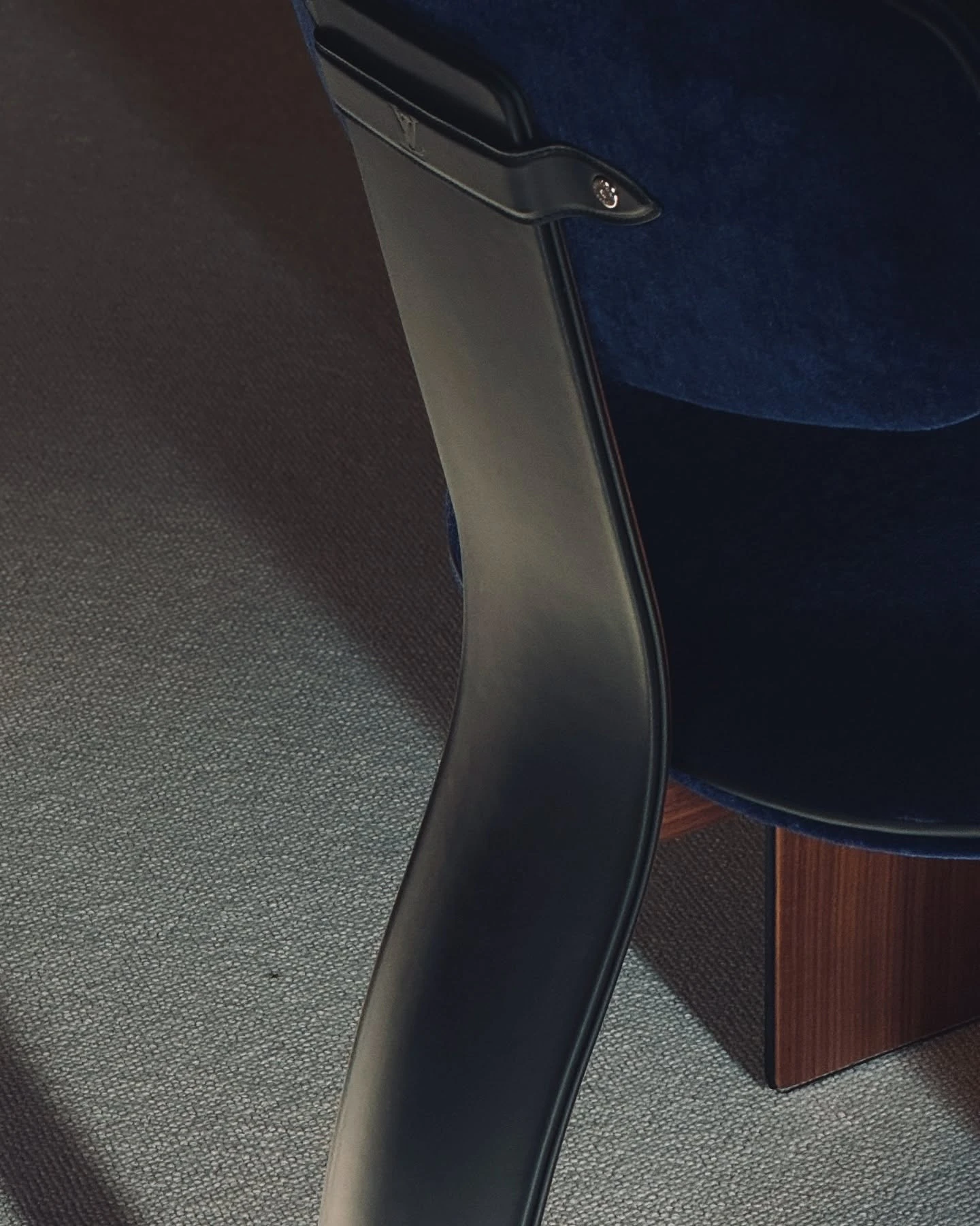 Es el caso de la silla de respaldo delgado Pegase, elaborada en cuero y madera natural, y la lámpara de mesa Noé, cuyo diseño está inspirado en el emblemático bolso Steamer de Louis Vuitton.