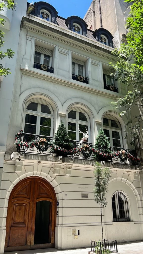 En escalones intercalados, Ramiro colocó delicados fanales con velas además de un gatito dorado símbolo de buena fortuna. En las barandas de hierro de época, el ambientador eligió una típica guirnalda navideña con adornos rojos.