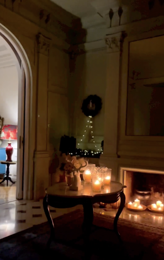En la chimenea colocó dos bandejas con velas de diferentes tamaños para recrear el fuego, y en uno de los rincones del espacio sumó una típica corona navideña con guirnaldas y luces cálidas que forman una especie de arbolito de Navidad.