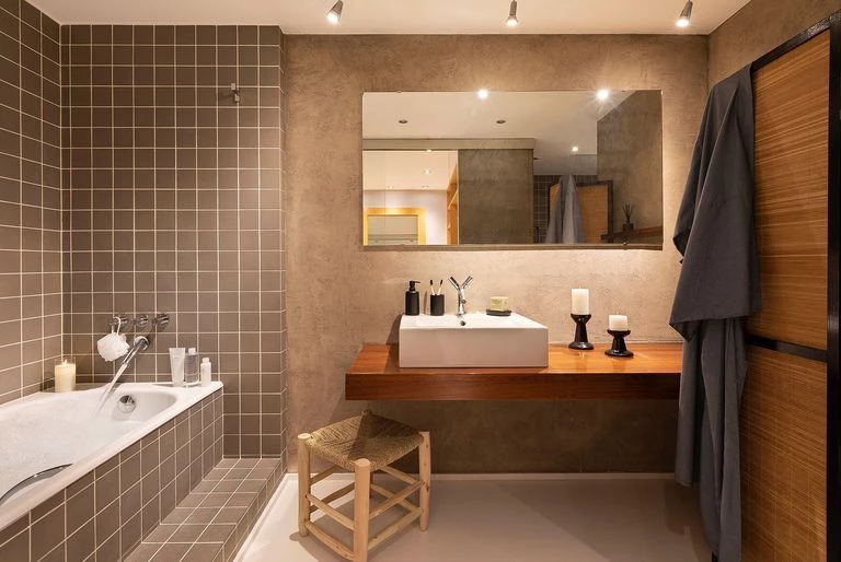 La bacha situó sobre una balda flotante de madera, y se añadió un taburete de fibras para completar la naturalidad y dar continuidad a la estética Japandi.