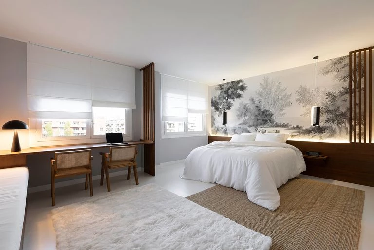 En el dormitorio suite, simplicidad y funcionalidad son las palabras que definen el ambiente zen, con cabecero de madera y mesitas de noche a medida.